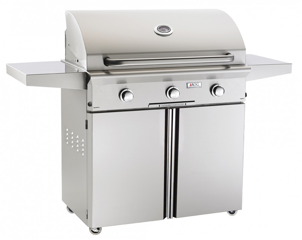 The AOG L-Series Cart-Mount Gas Grill - 36" features a high BTU capacity for searing. It comes with interior halogen lights and an easy