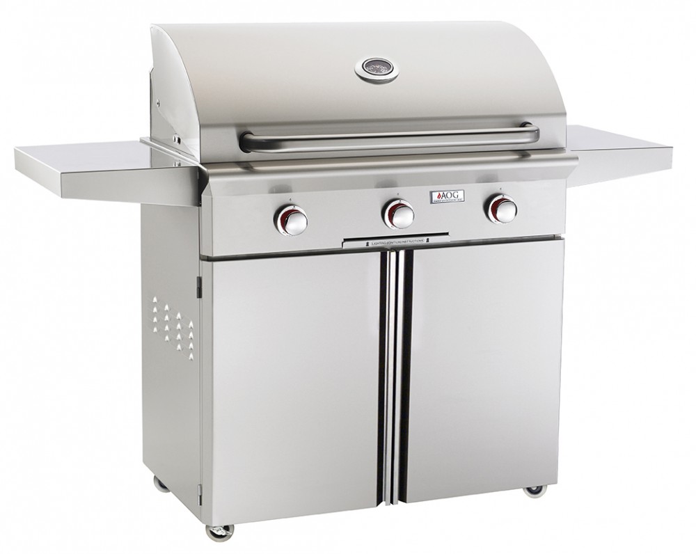 The AOG T-Series Cart-Mount Gas Grill - 36"  features a high BTU capacity for searing in flavor and juices. An easy push button piezo ignition system eliminates the need for batteries or a power source. This portable grill has outstanding cooking performance, durable construction and appealing design. It features a flush-mounted side burner, dual side shelves and ample storage area under the grill. With solid brass valves for precise temperature control and long life, along with the stainless steel vaporizing panels for even heat distribution, this grill will make you a grilling master.