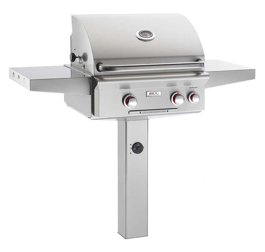 This model includes in-ground post mount, as shown. This mounts also includes a built-in timer in the post (black knob shown). After 3 hours, the gas supply is cut off, to help eliminate accidentally leaving the grill going!