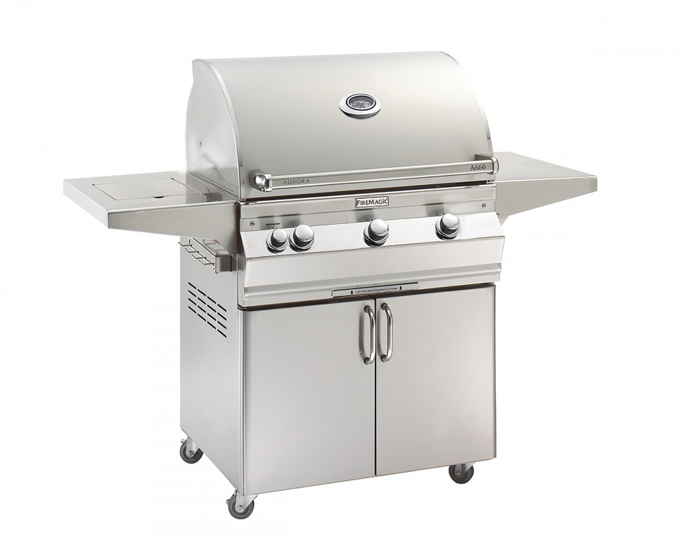 Crafting American-made premium grills for over 75 years, Fire Magic is dedicated to providing you with a quality outdoor cooking experience. From the moment you light your Fire Magic Aurora grill, you know you are on to something great. This Fire Magic gas grill features 304 stainless steel construction for lasting quality, and sleek styling with a seamless control panel and integrated analog thermometer. This Aurora gas grill features a spring-assisted, double-walled tear-drop hood, built-in interior lights, a removable warming rack, a 12V electric hot surface ignition with flash tube back-up and a 12 inch deep firebox for complete convection cooking. Three cast stainless steel E burners produce a total of 75,000 BTUs on the grilling surface, and the stainless steel Diamond Sear cooking grids provide an ample 660 square inches of grilling area while a secondary grid supplies 228 square inches for a total of 888 square inches. Cleaning the grill is easy with the included grid lifter and the disposable drip pan collection system that is designed to prevent grease pan flare-ups. This grill comes on a stainless steel cart with dual storage doors and two side shelves. The cart includes a single 15,000 BTU side burner flush mounted in one of the side shelves. Also included on the cart is a folding multi-tool holder, folding paper towel holder, and four locking casters. A 120V power source is required.