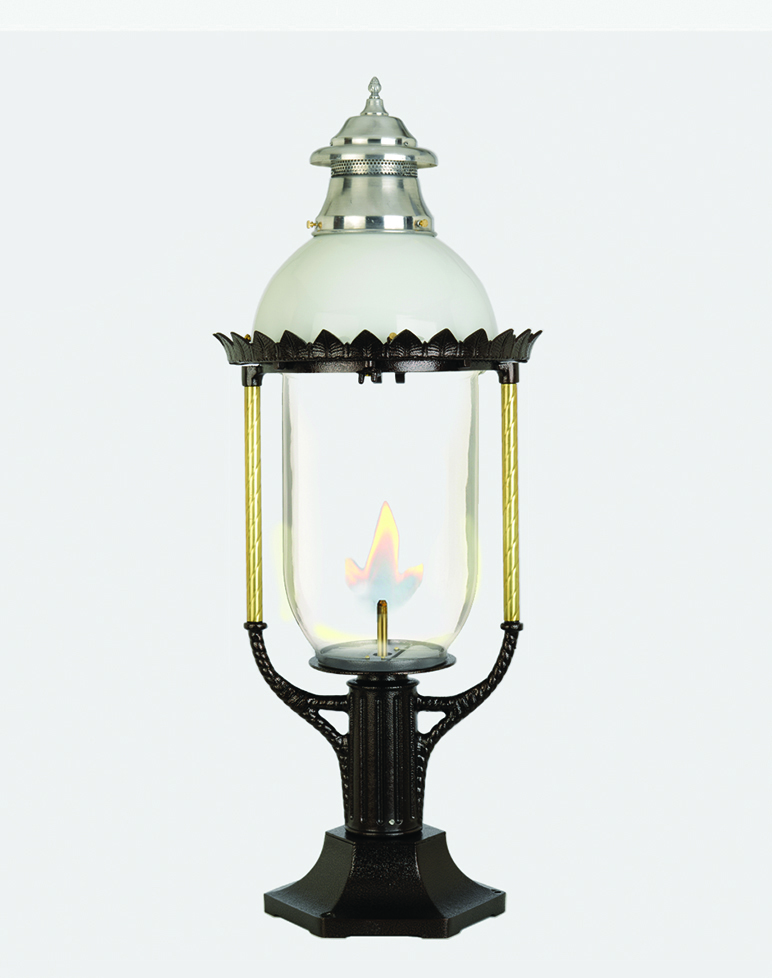 We stock gaslights in black, with dual inverted mantles. Please allow three weeks for delivery of others. Call for pricing on lighting options.