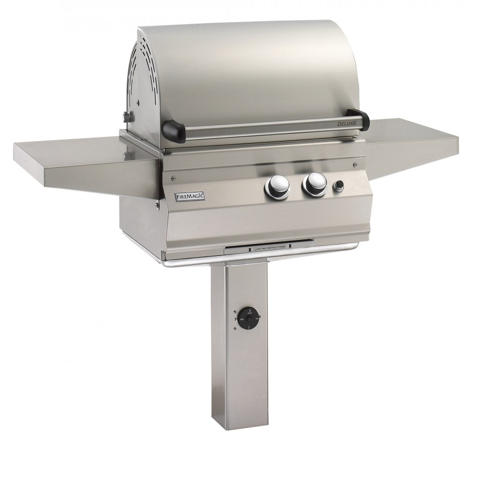 NOW you can have these features in a true stainless steel Post Mount gas grill! The post is designed to be sunk in the ground approximately 18". A natural gas line would be fed up the post to the control panel. Illustration shows a pedestal base.