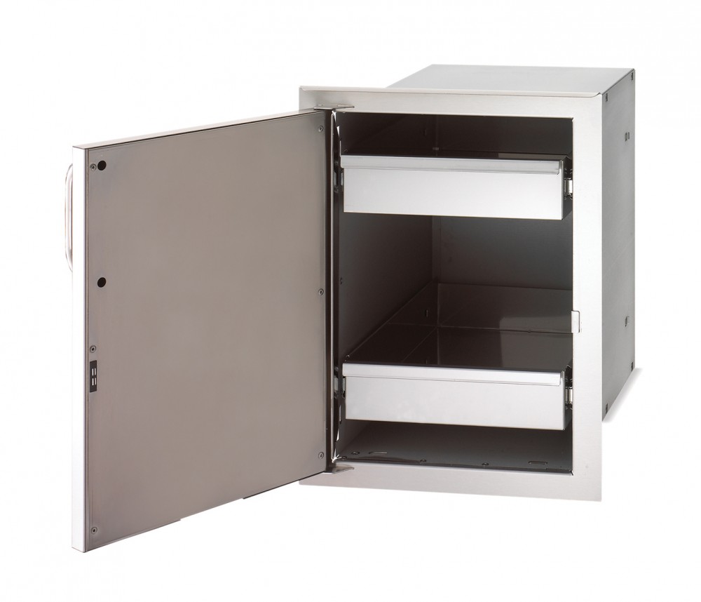 This Fire Magic Select Single Door with Dual Drawers - Left Hinge provides ample storage space for dishes and serveware in your outdoor kitchen. This double drawer unit will give your outdoor kitchen ample storage space. The frame of these drawers includes a rain lip, a curved edge that prevents moisture from entering spaces, preventing rust. Made of 304 stainless steel with sturdy double walled doors, and sporting a stylish handle, this durable unit will compliment your outdoor kitchen.