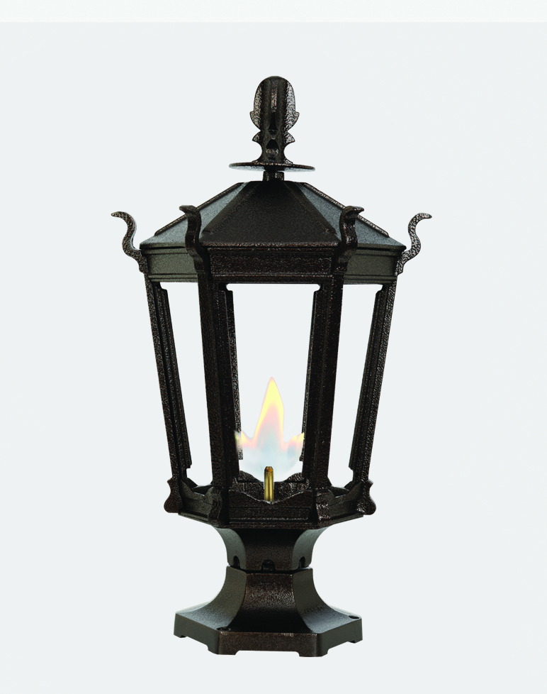 We stock gaslights in black, with dual inverted mantles. Please allow three weeks for delivery of others. Call for pricing on lighting options.